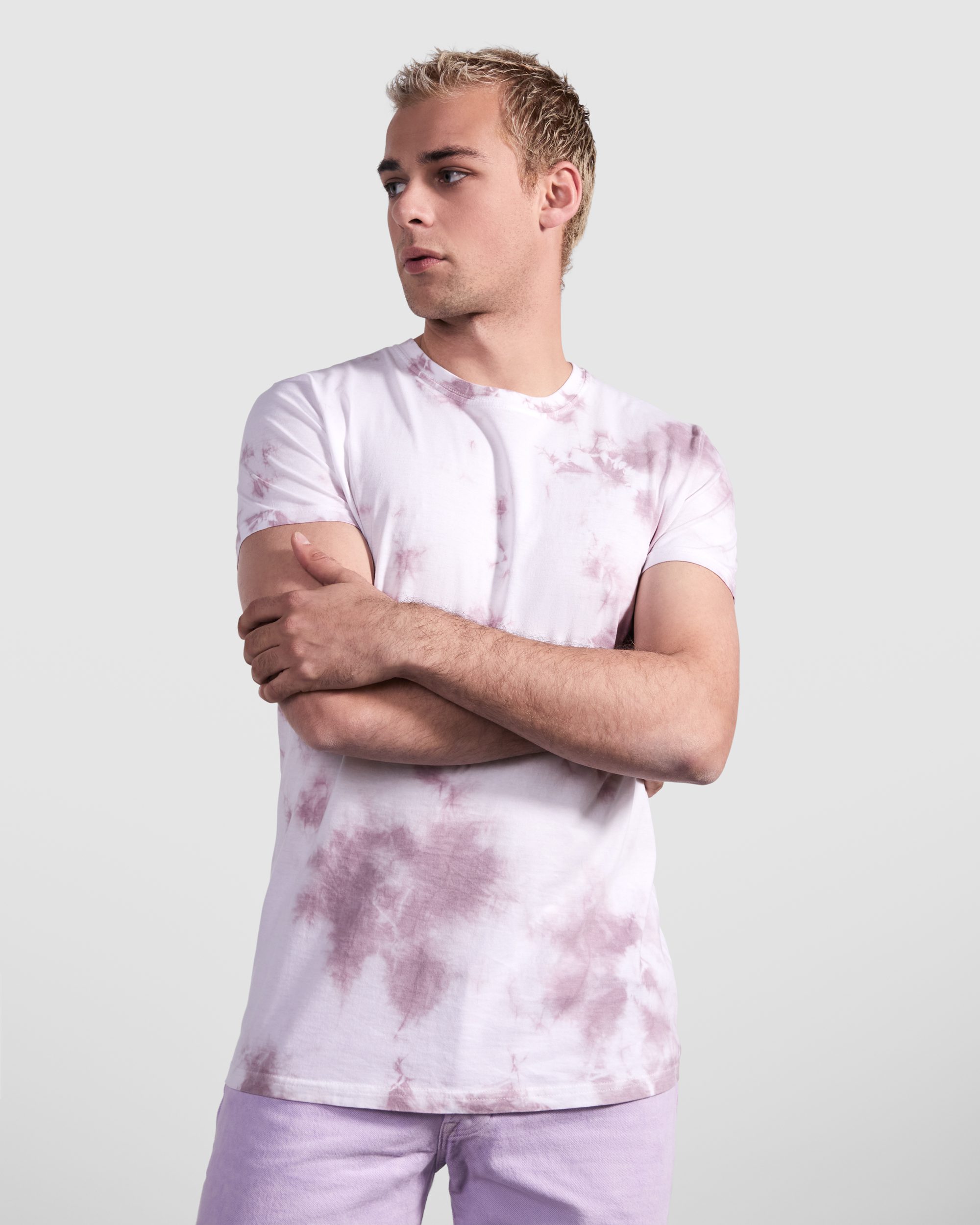 Camiseta tubular de manga corta unisex efecto Tie-Dye. Cuello redondo en canalé 1×1 con cubre costuras en cuello. El acabado y la tonalidad de esta prenda puede variar dentro de un mismo tono.